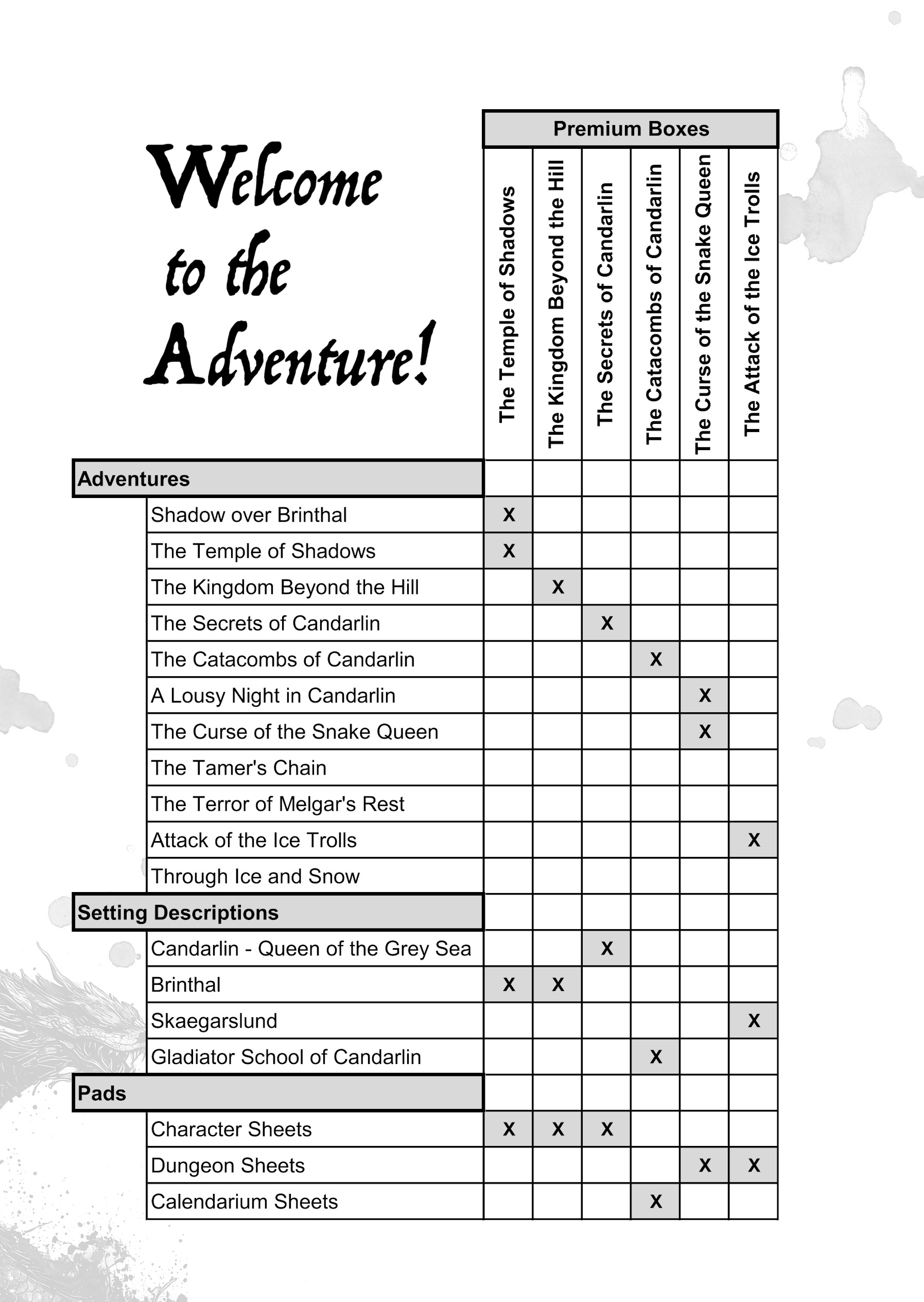 English Overview of all Products Recommended Reading Order Shadow over Brinthal – Downloads Character Sheet English Map of Brinthal Map of the Forest The Temple of Shadows – Downloads Character Sheet English Map of the Temple Ruins Map of the Sanctuary (blank) Map of Te Arras The Secrets of Candarlin – Downloads Character Sheet English Map of the City of Candarlin Map of the Kingdom Ogduria Map A1: The Hideout of Smugglers The Kingdom Beyond the Hill – Downloads Character Sheet English Map of the Village of Brinthal (Winter Edition) The Location Charts The Catacombs of Candarlin – Downloads Map A1: Candarlin by Day / Map A2: Candarlin by Night The Path of Masters – Advanced Rules A Lousy Night in Candarlin – Downloads Introduction The Terror of Melgar’s Rest – Downloads Introduction The Curse of the Snake Queen – Downloads Teilen mit: Klicke, um auf X zu teilen (Wird in neuem Fenster geöffnet) X Klick, um auf Facebook zu teilen (Wird in neuem Fenster geöffnet) Facebook Gefällt mir Wird geladen …